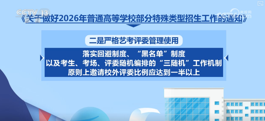 《通知》明確,一要設(shè)定考前輔導(dǎo)“禁區(qū)”,開展特殊類型招生的相關(guān)高校及其內(nèi)設(shè)學(xué)院、教職工不得組織、參與或自行開展相關(guān)考前輔導(dǎo)、應(yīng)試培訓(xùn)。二是嚴(yán)格藝考評委管理使用,落實(shí)回避制度、“黑名單”制度,以及考生、考場、評委隨機(jī)編排的“三隨機(jī)”工作機(jī)制,原則上邀請校外評委比例應(yīng)達(dá)到一半以上。三是建立藝考評委專家?guī)?,一旦發(fā)現(xiàn)評委存在可能影響考試招生公平公正行為,堅(jiān)決嚴(yán)肅查處并納入“黑名單”。