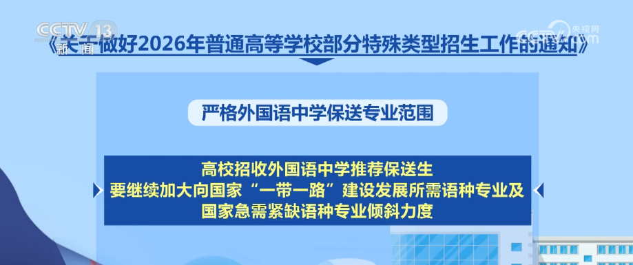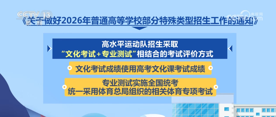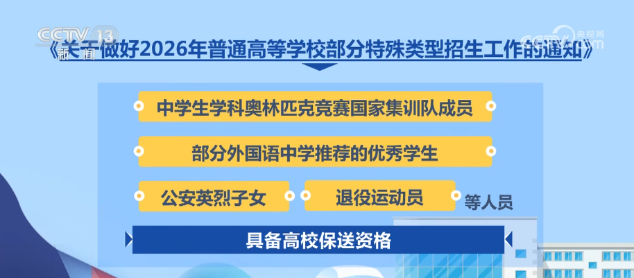 央視網(wǎng)消息:日前,教育部印發(fā)《通知》,部署做好2026年普通高校部分特殊類型招生工作。普通高校特殊類型招生主要包括藝術(shù)類專業(yè)招生、高水平運(yùn)動(dòng)隊(duì)招生、保送生、綜合評價(jià)招生4類。