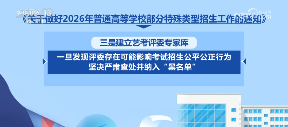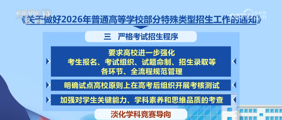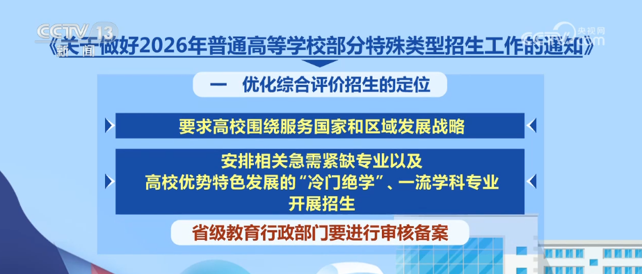 對于2026年普通高校部分特殊類型招生工作,《通知》要求,各地各有關(guān)高校建立有效監(jiān)督機(jī)制,暢通社會(huì)監(jiān)督渠道,及時(shí)公開公示有關(guān)信息,主動(dòng)接受監(jiān)督。未按要求公示的考生一律不得錄取,牢牢守住公平公正底線。
